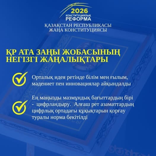 Қазақстан Республикасында 2026 жылға жоспарланған конституциялық реформа аясында Ата Заңның жаңа жобасы ұсынылды. Құжат елдің құқықтық жүйесін жаңғыртуға, мемлекеттік басқаруды жетілдіруге және қоғам дамуының заманауи талаптарына сай құқықтық негіз қалыптастыруға бағытталған.