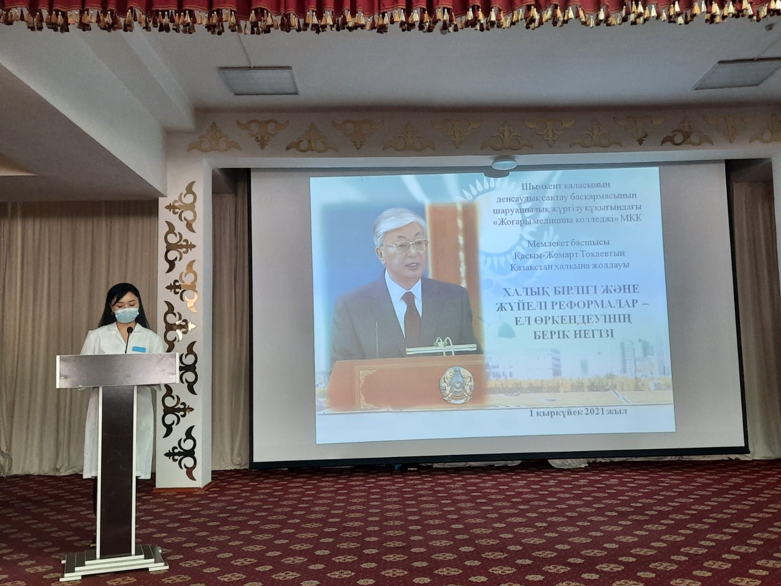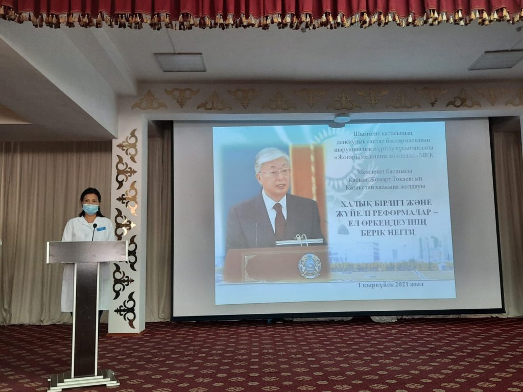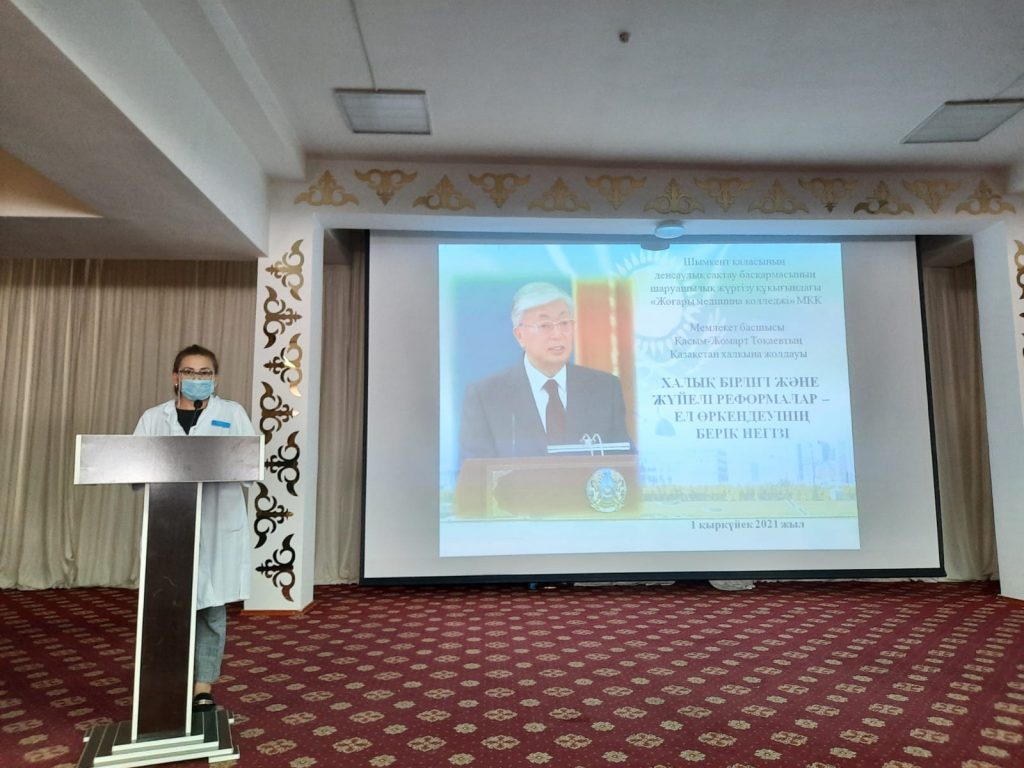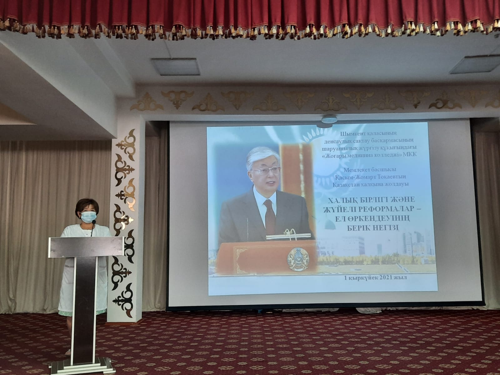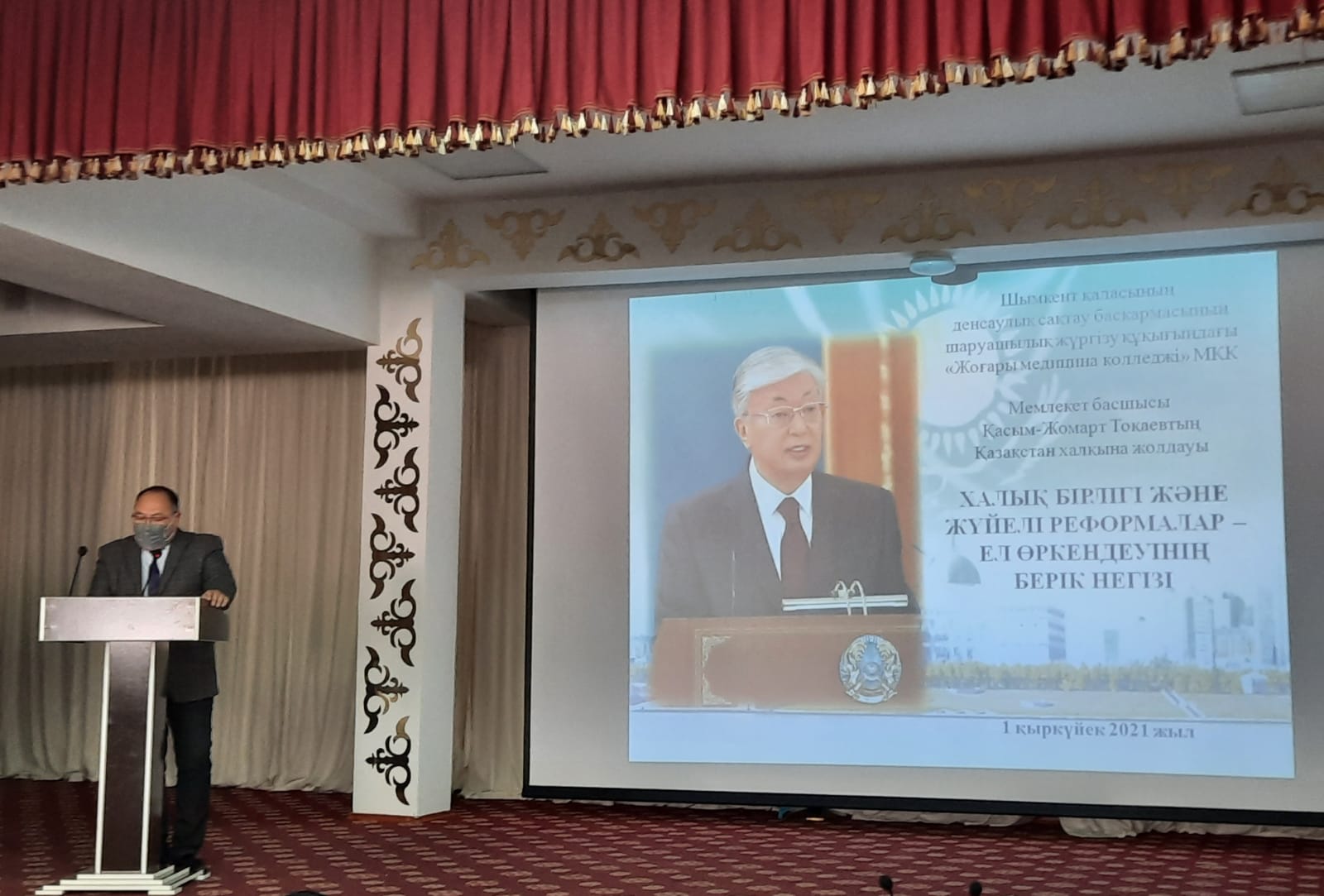 13 сентября по инициативе директора ГКП на ПХВ «Высший медицинский колледж» управления здравоохранения г. Шымкента Абишева Галымжана Мотаевича, преподаватели гуманитарно-экономических дисциплин провели собрание среди преподавателей по обсуждению Послания Президента К.-Ж.К.Токаева народу Казахстана от 1 сентября 2021 года.