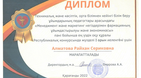 According to the work plan of the CMA on the spec ialty “Pharmacy”, was held a republican competition for the best textbook