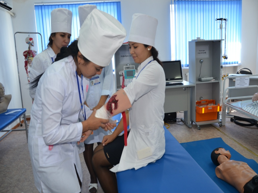 Колледждің орталығының бөлмелері заманауи механикалық тренажерлармен, муляждармен, фантомдармен, манекендермен, сондай-ақ пациентпен жұмыс істеудің практикалық дағдыларын үйренуге және болашақ маманның клиникалық ойлау негіздерін бекітуге мүмкіндік беретін пациенттер тренажерлерімен жабдықталған.