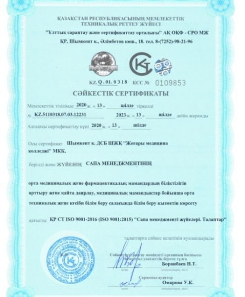 Жоғары медицина колледжінде 2008 жылдан бері Сапа менеджмент жүйесі енгізілген. Қазіргі таңда ҚР СТ ISO 9001:2015 стандарты талаптарының сәйкестігіне бағаланып тіркелді және сәйкестік сертификатын иеленді