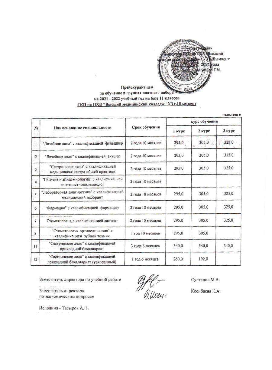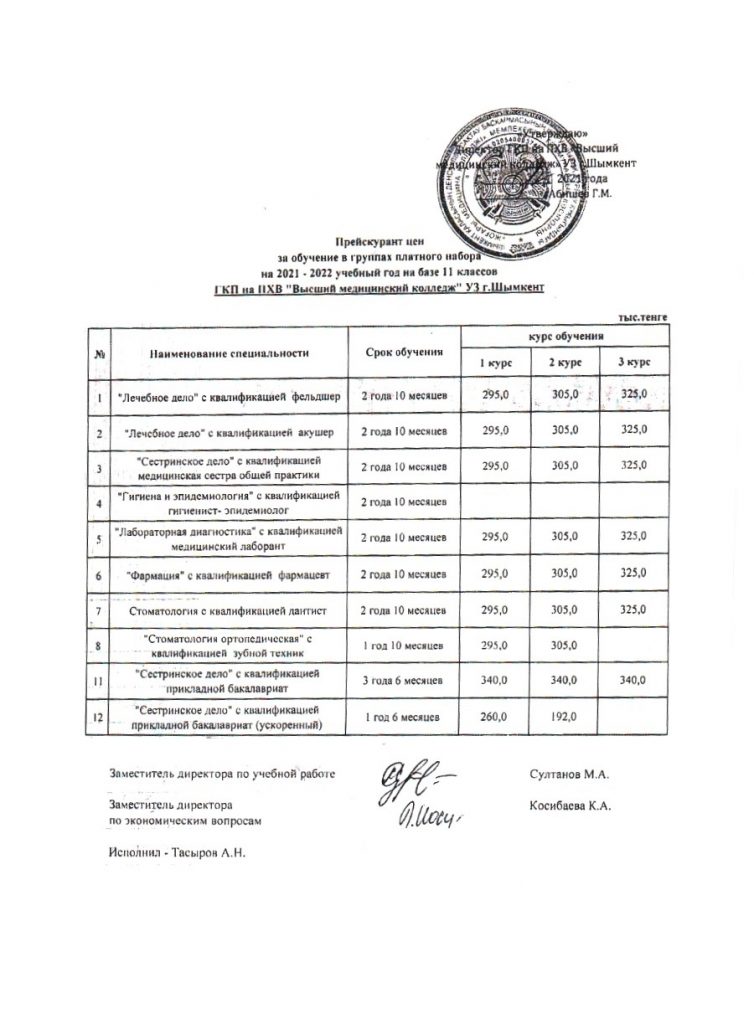 Высший медицинский колледж Шымкента > Прейскурант цен на 2021-2022 учебный год